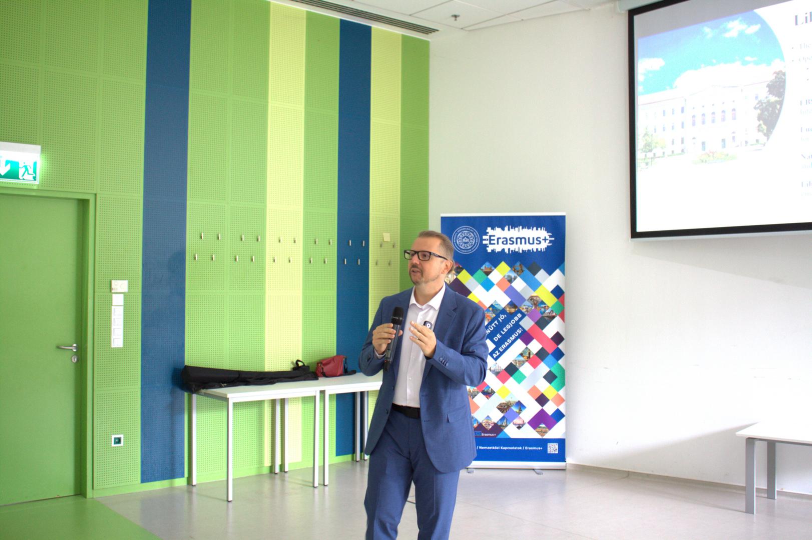Szirbik Miklós, az Európai Köz- és Magánjogi Tanszék adjunktusa az európai jogi tanulmányok fontosságáról beszélt. Hangsúlyozta, hogy az európai és nemzetközi jog izgalmas terület, amely az Európai Unió döntéshozatali folyamatait és jogi hatásköreit vizsgálja. A tanszék az elméleti tudást gyakorlati tapasztalatokkal ötvözi, különös tekintettel a jogvitákra, amelyek gyakran drámai és izgalmas helyzeteket teremtenek. Példaként említette a „Dassonville-formula” bírósági döntést, amely maradandó élményt nyújt a hallgatók számára.