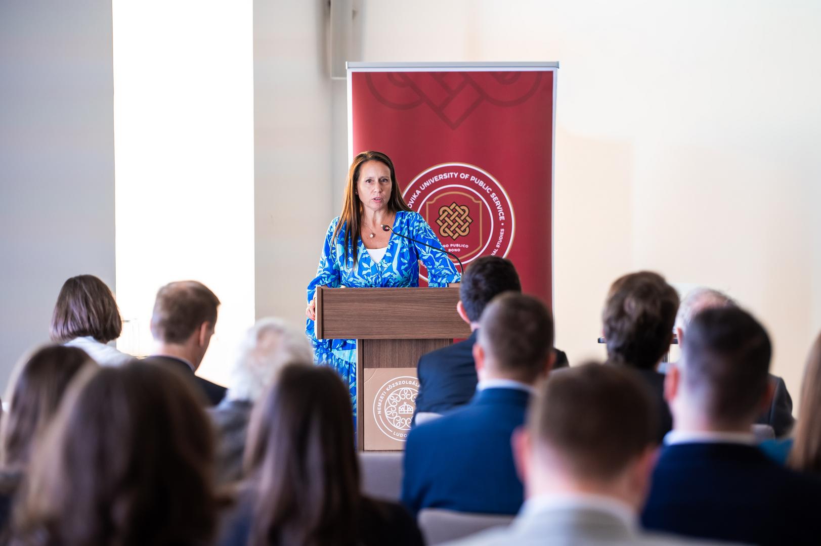 Varga Réka, az ÁNTK dékánja köszöntőjében felidézte az 1975-ös Helsinki Záróokmány történelmi szerepét, amely a hidegháború közepette is a párbeszéd, a bizalom és a közös felelősségvállalás mellett tette le a voksot. Hangsúlyozta, hogy a konferencia célja nemcsak a múlt megidézése, hanem a jelen kihívásainak értelmezése a helsinki értékek tükrében. „Ötven évvel ezelőtt ténylegesen kijelentették, hogy a politikai és jogi vitákat erőszak alkalmazása nélkül kell megoldani” – emelte ki Varga Réka, hozzátéve, hogy a záróokmány szellemisége ma is érvényes útmutató a fenntartható béke, igazságosság és jólét érdekében.