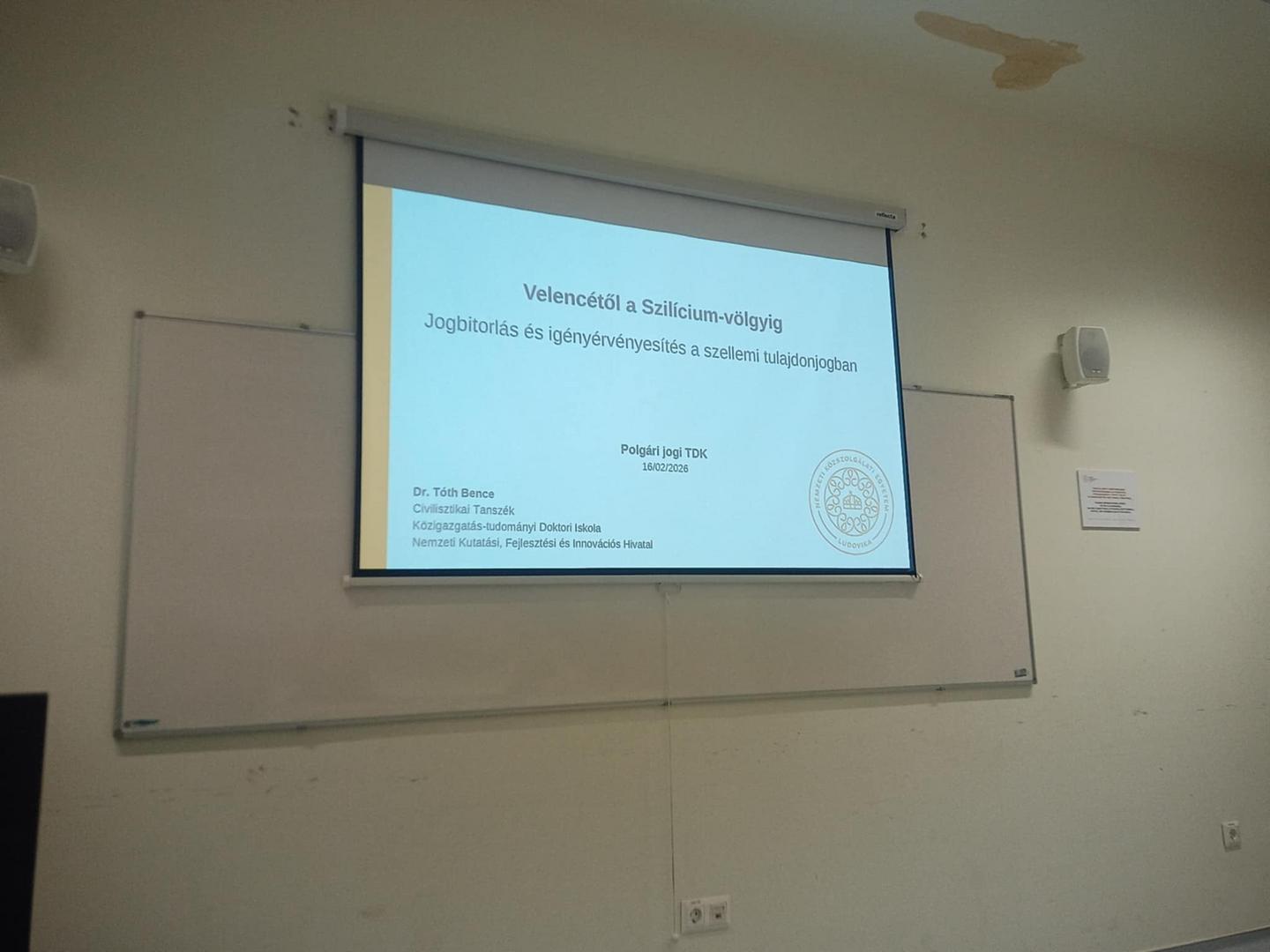 2026. február 16-án tartotta meg a Polgári Jogi Tudományos Diákkör a félév első nyilvános eseményét. Meghívott előadóként dr. Tóth Bence, a Nemzeti Kutatási, Fejlesztési és Innovációs Hivatal munkatársa és a Civilisztikai Tanszék PhD-hallgatója tartott előadást „A szellemi tulajdon védelme és a kapcsolódó igényérvényesítés" témakörében.
