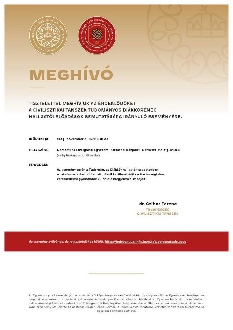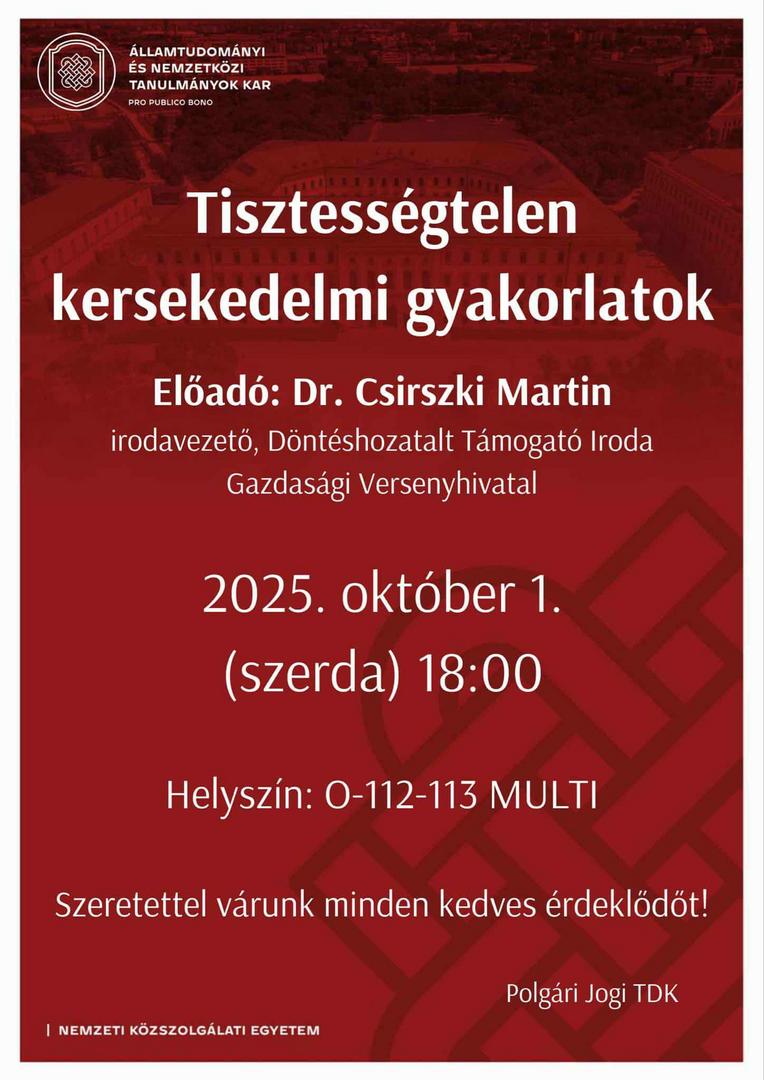 2025. október 1-jén tartotta meg a Polgári Jogi Tudományos Diákkör a félév első nyilvános eseményét. Vendégelőadóként Dr. Csirszki Martin (Gazdasági Versenyhivatal Döntéshozatalt Támogató Iroda irodavezetője) tartott előadást „Tisztességtelen kereskedelmi gyakorlatok” címmel.